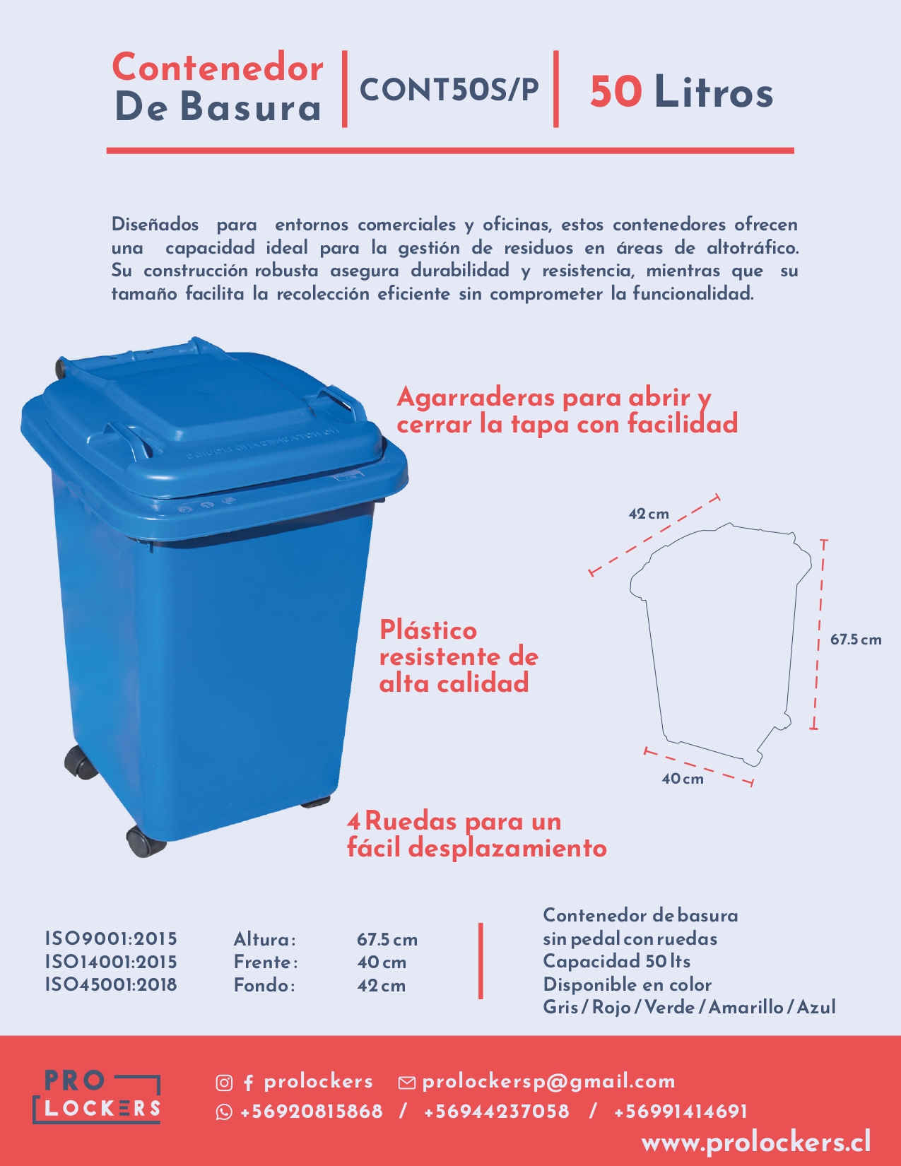 Onloop | PROLOCKERSEl contenedor de basura plástico de 50 litros con ruedas está diseñado para la gestión eficiente de residuos en entornos institucionales, operativos y de servicios generales. Su capacidad permite concentrar mayores volúmenes de residuos, reduciendo la frecuencia de vaciado en áreas de uso intensivo.